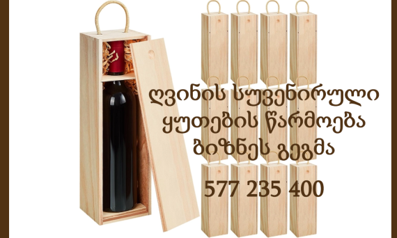 🍷 ღვინის სუვენირული ყუთების წარმოება – სრული ბიზნეს გეგმა და მომგებიანი ნიშა ქართულ ბაზარზე Updated march 13, 2026 📞 ბიზნეს გეგმების მომზადება: 577 235 400; 📧 ელფოსტა: Caumednet@gmail.com საქართველო მსოფლიოში ერთ-ერთი უძველესი ღვინის კულტურის ქვეყანაა. ყოველწლიურად მილიონობით ტურისტი სტუმრობს საქართველოს და მათგან ბევრი ცდილობს ქართული ღვინო სუვენირად წაიღოს საკუთარ ქვეყანაში. სწორედ ამიტომ ღვინის სუვენირული შეფუთვა